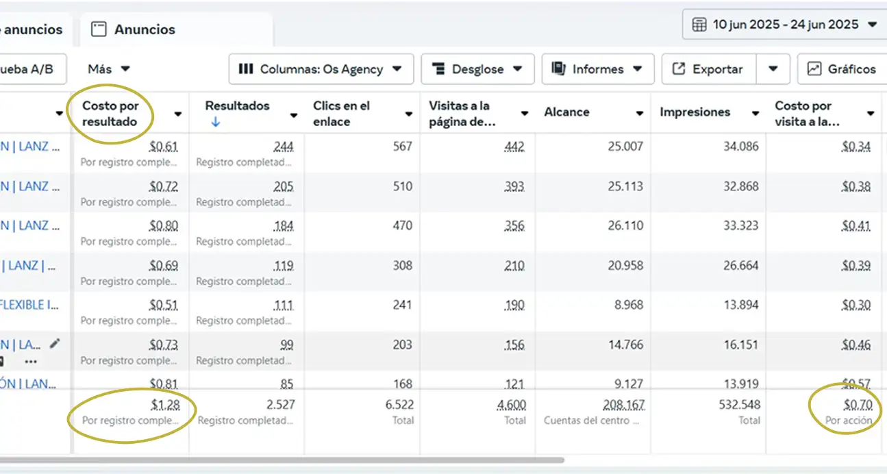 Este también podría ser tu caso de éxito. Un coste por resultado de $1.28 generando miles de leads.